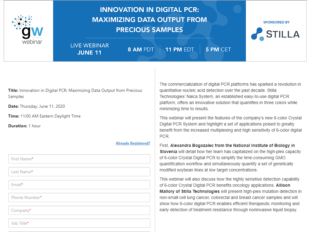未来已来,Stilla公司在6月分享月以“Naica™六通道数字PCR多重检测”为主题,举办系列在线讲座,分享6色Crystal Digital PCR多重检测技术、6通道检测方法的建立和多种应用案例。